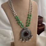 Be the first to review “Three-Strand Oxidized Silver Necklace with Green Beads and a Central Pendant.” Cancel reply