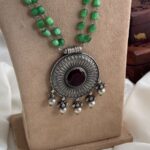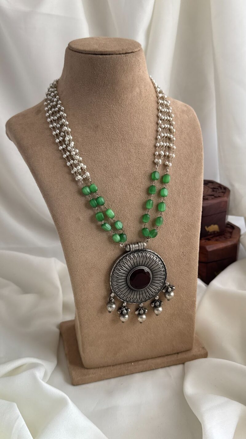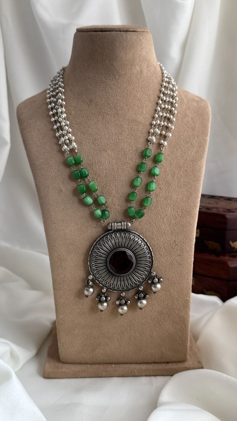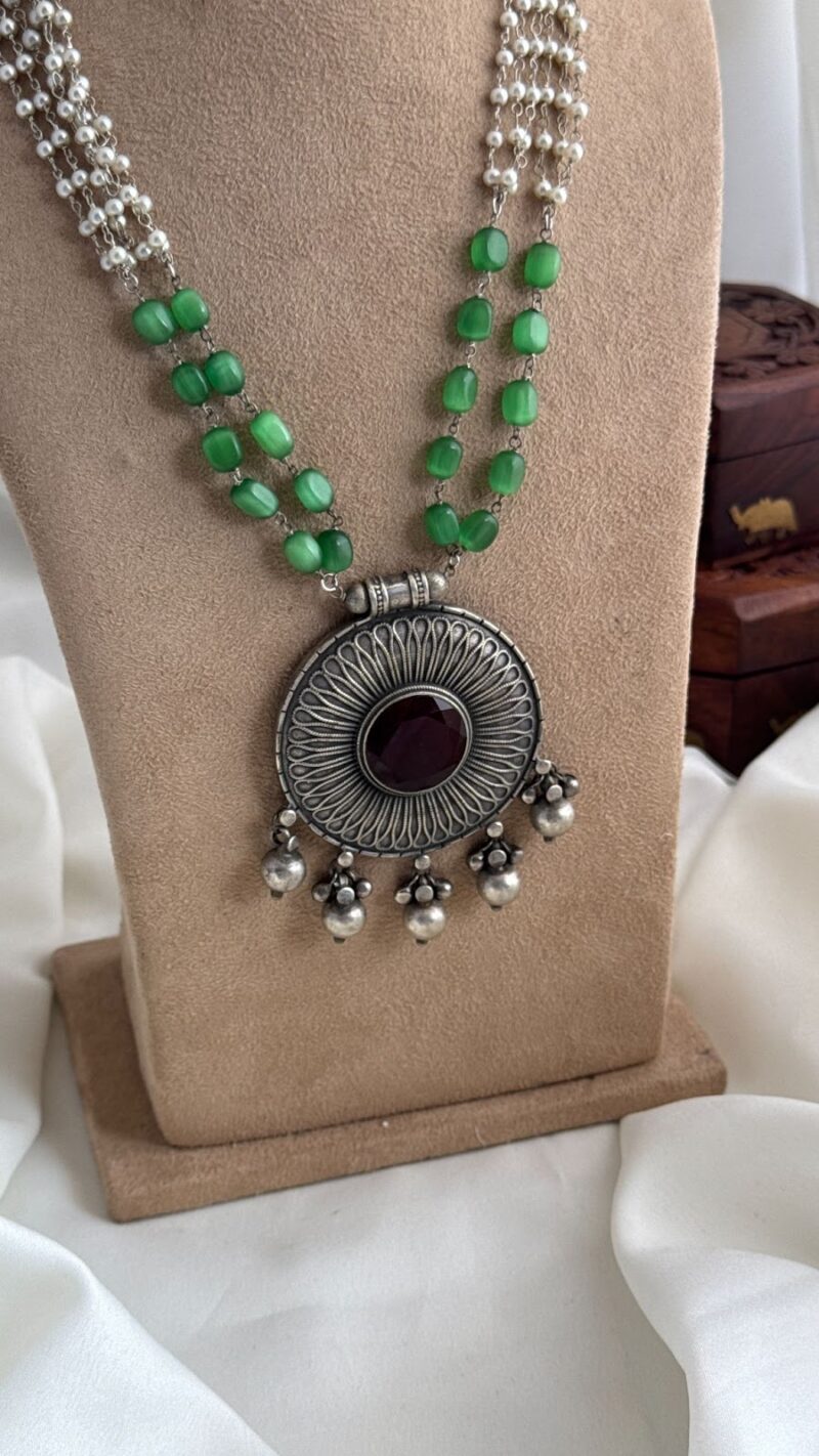 Three-Strand Oxidized Silver Necklace with Green Beads and a Central Pendant.